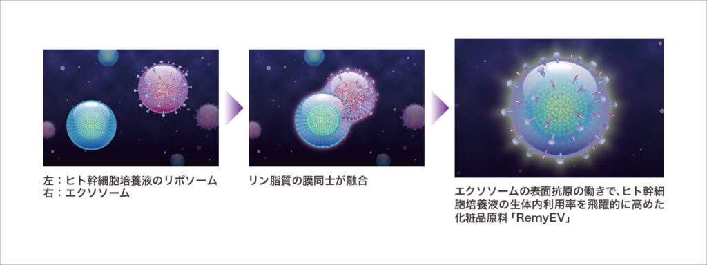 弊社の独自原料の一つにRemyEVがあります。この原料はハイブリッドエクソソームと呼ばれる特殊な技術が用いられているヒト幹細胞培養液の化粧品原料です。