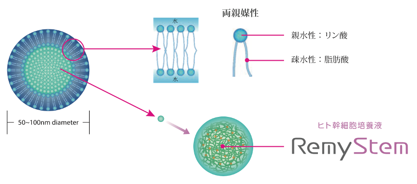 弊社のヒト幹細胞培養液の化粧品原料は、11製品ありますが、そのうち半数の6製品はヒト幹細胞培養液をリポソーム加工した原料となっています。リポソームというのはリン脂質の二重膜でできたカプセル状の粒子で、弊社の場合その中にはヒト幹細胞培養液が内包されています。リポソーム化粧品の歴史は意外と長く、1990年代より化粧品に用いられていますが、元々は医薬品を狙った場所に届けるDDS(ドラッグデリバリー)のための技術です。不安定な医薬品成分を守り、必要な場所に届けることが目的で開発されました。この特徴はヒト幹細胞培養液を化粧品原料として実用化するには、大変に相性の良い技術でした。
